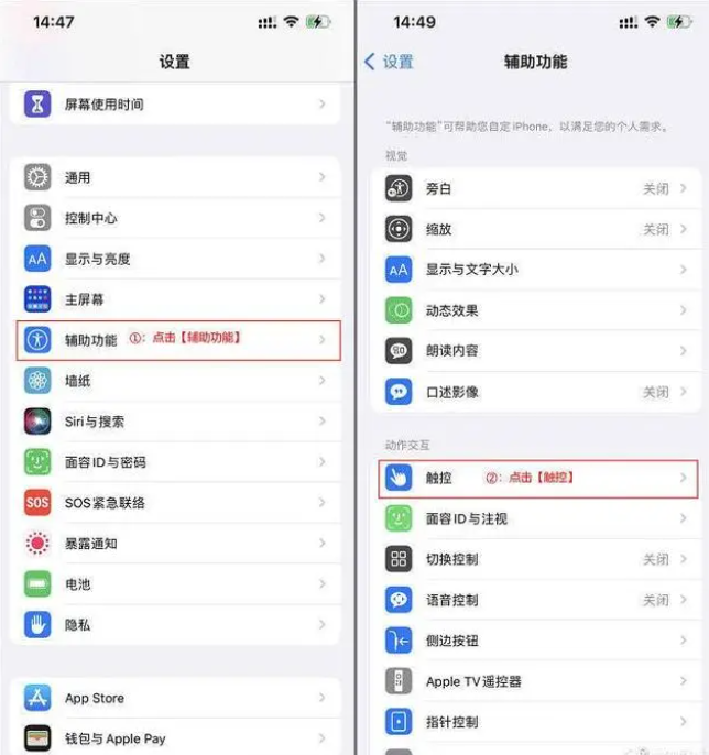 1、首先打開蘋果手機的【設置】接著點擊【輔助功能】選擇【觸控】;