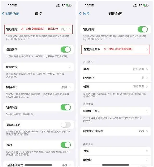 2、打開輔助觸控,點(diǎn)擊自定頂層菜單。