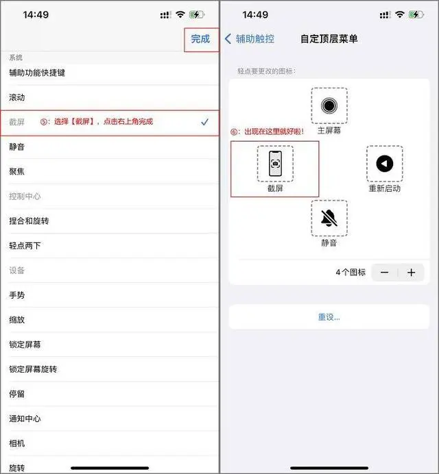 3、找到“截屏”以后勾選然后點(diǎn)擊右上角完成,完成以后“截屏”的按鈕就出現(xiàn)在了“觸控”當(dāng)中。