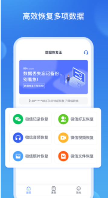 數(shù)據(jù)恢復(fù)王是一款專業(yè)的手機數(shù)據(jù)恢復(fù)軟件,它通過強大的系統(tǒng)底層掃描檢測技術(shù),快速的找回并恢復(fù)您丟失的手機數(shù)據(jù),支持誤刪及未保存微信語音、圖片、視頻、文件恢復(fù)。