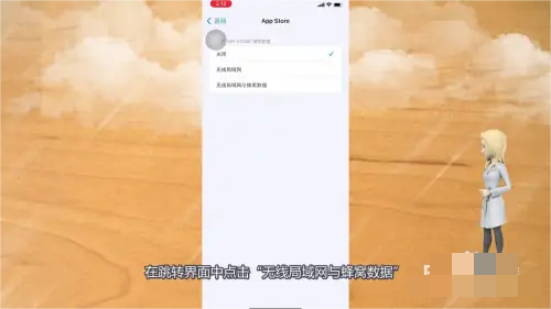 3.打開App Store網(wǎng)絡權限,打開新頁面后,點擊下方App Store,在跳轉界面點擊“無線局域網(wǎng)和蜂窩數(shù)據(jù)”,即可登錄App Store。