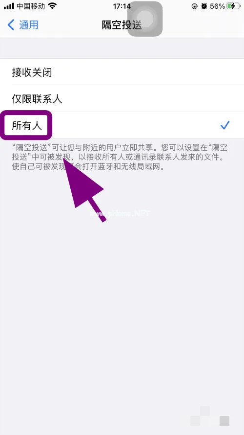 5、在空投設(shè)置頁面,點(diǎn)擊選擇【所有人】,完成,這樣當(dāng)兩部手機(jī)靠近的時(shí)候會(huì)有響應(yīng),并彈出轉(zhuǎn)賬頁面,成功解決了這個(gè)問題;