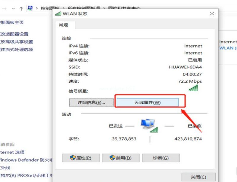 2、然后在網(wǎng)絡(luò)和共享中心的頁(yè)面中,選擇已經(jīng)連接的wifi連接,在彈出的WLAN狀態(tài)中選擇無(wú) 線屬性。