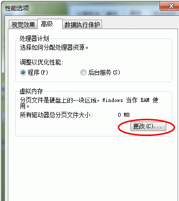 2、在性能窗口中選擇“高級(jí)”選項(xiàng)卡,然后單擊“虛擬內(nèi)存”下的更改按鈕。