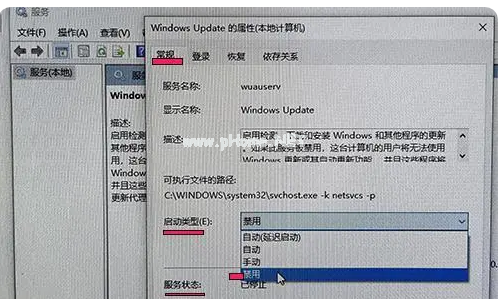 4、常規(guī)菜單下,啟動類型,選禁用;服務(wù)狀態(tài),選停止。
