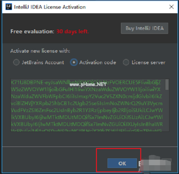 4、在activation code的頁面中,輸入Idea激活碼,點擊ok就完成了,這里的注冊碼大家可以百度去搜索獲取最新的。