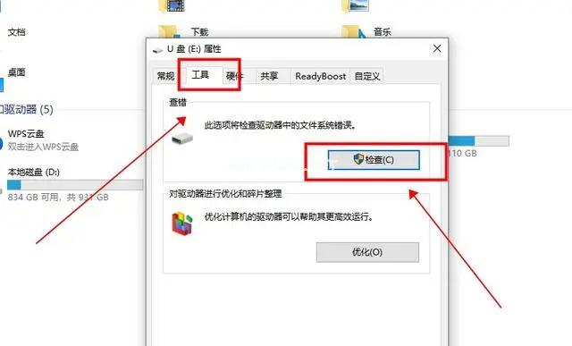2、進入U盤屬性中,選中工具選項卡,點擊“檢查”。