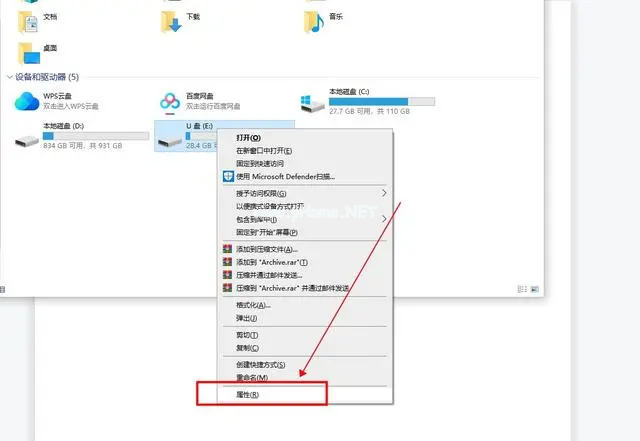 1、在電腦的“此電腦”中,右鍵U盤點擊“屬性”。