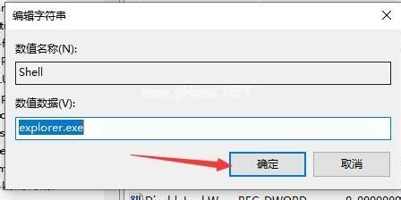 7、鼠標(biāo)雙擊它,在彈出的窗口界面把數(shù)據(jù)修改為explorer.exe,點(diǎn)擊【確定】重啟電腦即可解決win10開機(jī)黑屏只有鼠標(biāo)的問題