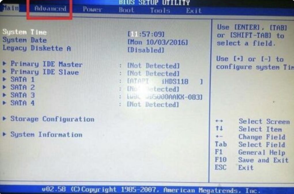 1、重啟電腦后,鼠標(biāo)點(diǎn)擊鍵盤上的“DEL”鍵進(jìn)入BIOS設(shè)置的界面,選擇Advanced選項(xiàng),如下圖所示。