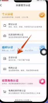 6、將抖音官方認證頁面打開后,在組織認證里面選擇【企業(yè)認證】。