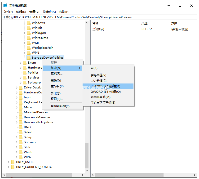 3、接著將項命名為StorageDevicePolicies,在右邊空白處,鼠標右鍵點擊新建【DWORD(32位)值】,將其命名為WriteProtect,鼠標雙擊打開。