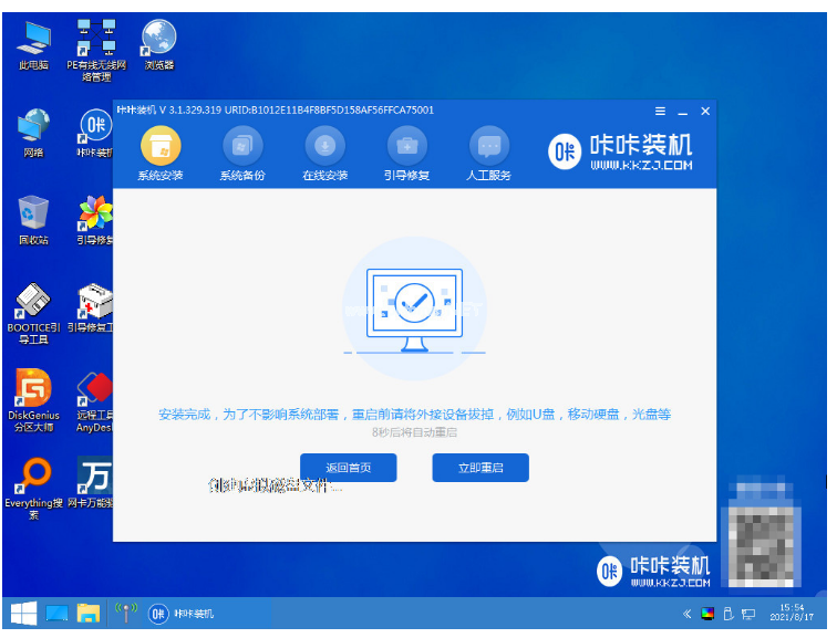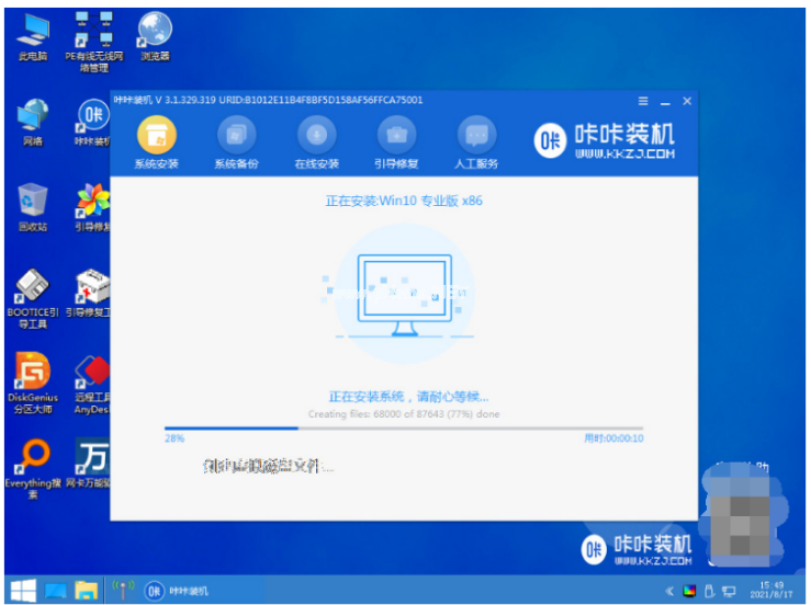 5、電腦在pe系統(tǒng)內(nèi),咔咔裝機(jī)工具此時(shí)將會(huì)自動(dòng)安裝win10系統(tǒng)。
