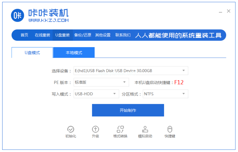 1、我們先在可用的電腦上下載安裝好咔咔裝機(jī)一鍵重裝系統(tǒng)工具打開,插入一個(gè)8g以上的空白u(yù)盤到電腦上,選擇u盤模式。