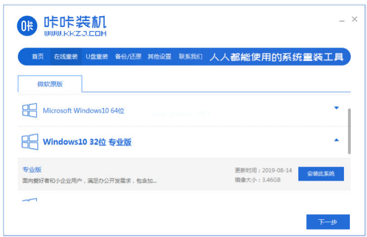 1、打開咔咔裝機(jī)一鍵重裝系統(tǒng)工具,選擇win10系統(tǒng)進(jìn)行安裝;