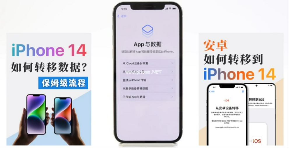 7、接下來是APP與數(shù)據(jù)操作,比如如果從老iPhone轉(zhuǎn)移數(shù)據(jù)到新iPhone 14,或是安卓機(jī)數(shù)據(jù)轉(zhuǎn)移到iPhone 14,這個(gè)根據(jù)自己的需求進(jìn)行選擇,然后根據(jù)提示完成數(shù)據(jù)遷移即可。如果沒有數(shù)據(jù)遷移,直接點(diǎn)擊底部的「不傳輸APP與數(shù)據(jù)」即可。