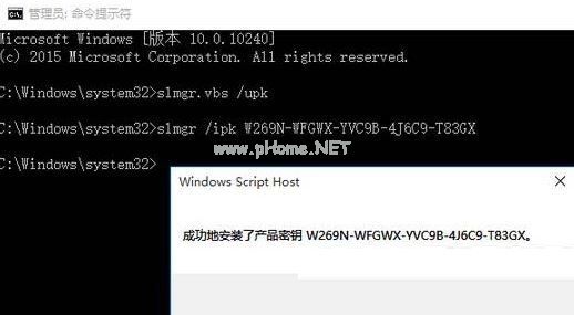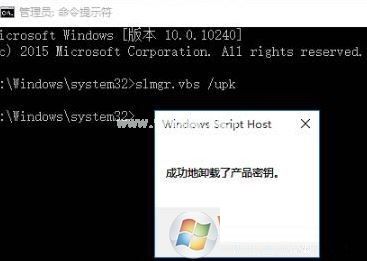 2.、在打開的框中輸入:slmgr.vbs /upk 按下回車鍵 ,提示“成功地卸載了產(chǎn)品密鑰” 點擊【確定】即可,如圖: