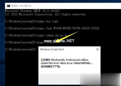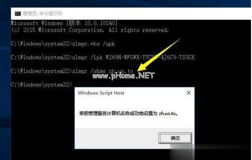 4.然后繼續(xù)輸入以下命令: slmgr /skms zh.us.to 按回車后將彈出“密鑰管理服務(wù)計算機名成功的設(shè)置為zh.us.to”的提示;
