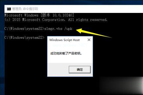 2.從打開的“命令提示符”窗口中,輸入命令:slmgr.vbs /upk ,按回車鍵即可彈出如圖所示的“已成功卸載了產(chǎn)品密鑰”的提示。注意:也可以通過先復(fù)制以上命令,然后在MSDOW窗口中右擊鼠標即可完成命令的粘貼操作;