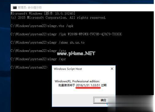 6.在此我們可以查看一下此密鑰的激活天數(shù),輸入以下命令:slmgr /xpr 按回車鍵后,將彈出窗口,提示”批量激活的過期時間”。當此激活操作過期后,我們只需要重新激活一次,即可再享受180天激活機會;