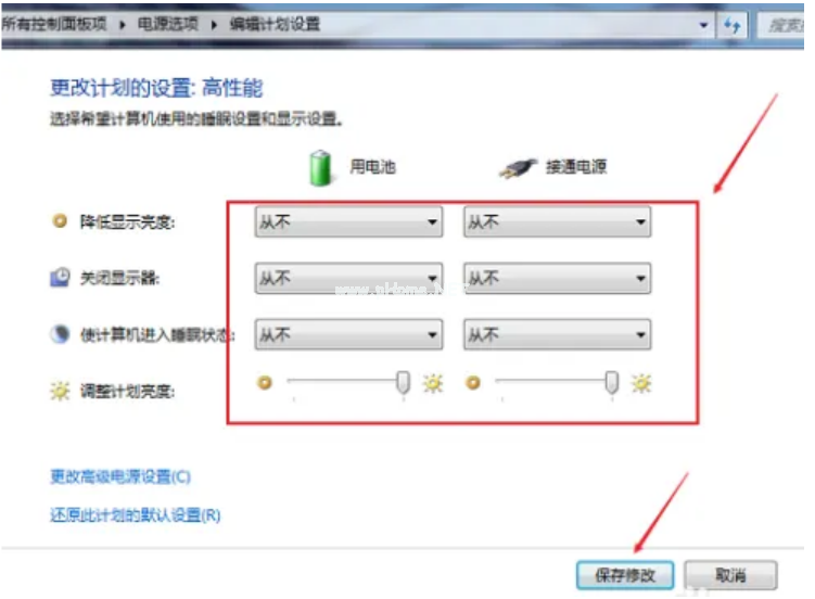 7、然后將里面的選項全部設(shè)置為“從不”,點擊“保存修改”,電池就可以激活了。