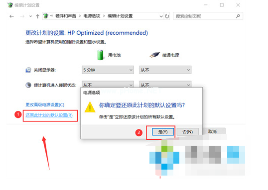11、鼠標點擊還原此計劃的默認設置,點擊確定即可解決電腦睡眠后黑屏打不開的問題。