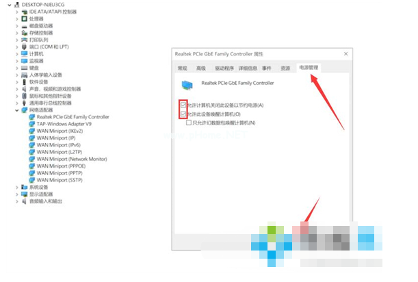 3、點擊電源管理,接著勾選允許計算機關(guān)閉此設備以節(jié)約電源,勾選允許此設備喚醒計算機,點擊確定即可修復解決。