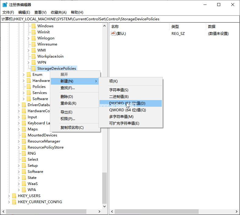 3、接著將項命名為StorageDevicePolicies,接著在右側(cè)空白處,鼠標右鍵點擊新建【DWORD(32位)值】,將其命名為WriteProtect,雙擊打開。