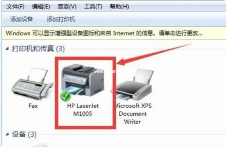 4、點(diǎn)擊“查看設(shè)備的打印機(jī)”,進(jìn)入后鎖定自己的打印機(jī)設(shè)備(M1005)。