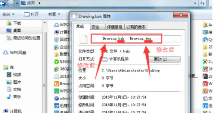 4、鼠標(biāo)單擊選中此文件,然后單擊右鍵,找到最下面的屬性選項,點擊進(jìn)入頁面,在“常規(guī)”選項中將文件的后綴由“.bak”更改成“.dwg”,然后點擊“確定”進(jìn)行更改: