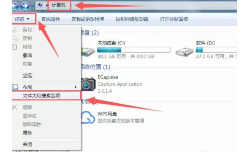 1、打開我的電腦,在左上角找到“工具”選項,在工具中找到“文件夾和搜索選項”: