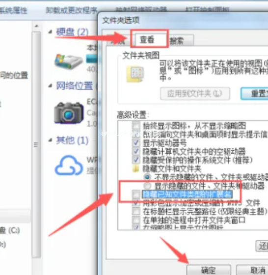 2、點擊打開,然后在打開的文件夾選項中找到“查看”,然后找到“隱藏已知文件類型的擴展名”,通過取消選擇將此功能關(guān)閉,然后點擊“確定”進(jìn)行更改設(shè)置: