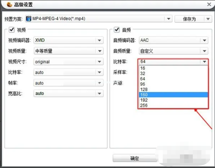 2、在高級設(shè)置中音頻框比特率選項中點擊下拉框修改視頻的比特率,修改完成后點擊確定就ok了。
