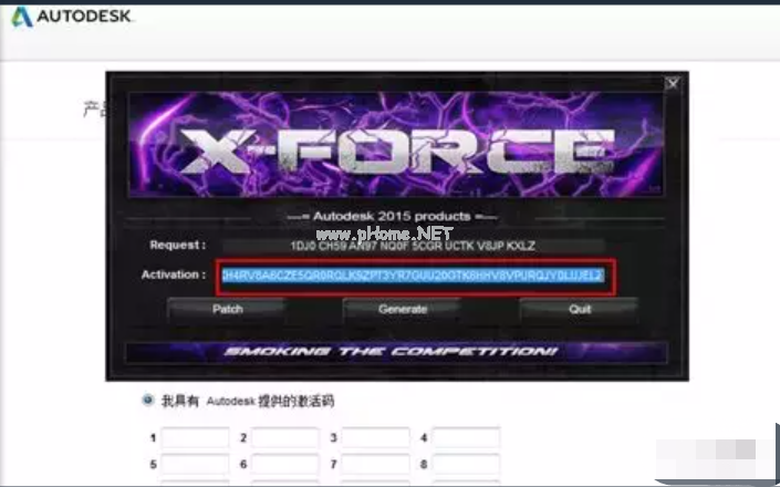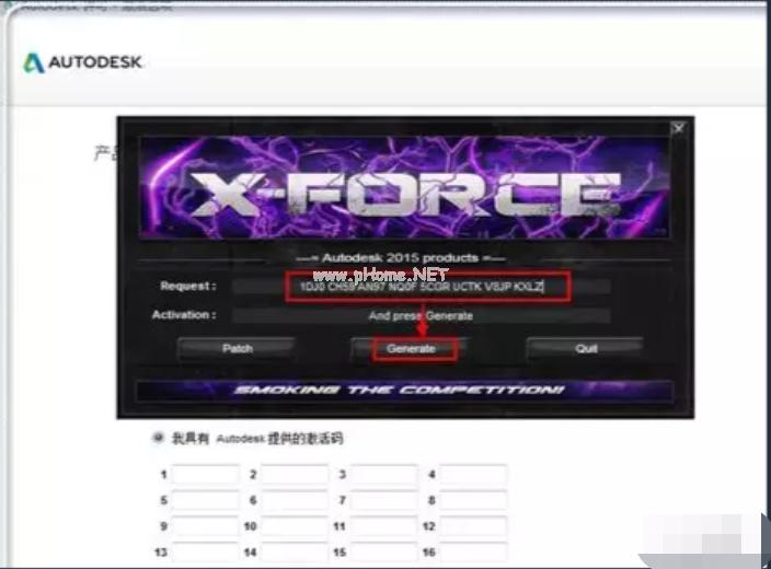 6、然后使用“ctrl+c”,復制注冊界面中的“申請?zhí)枴?,粘貼到注冊機的“request”中,然后點擊“generate”,產(chǎn)生激活碼。