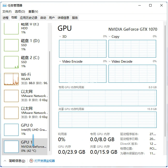 游戲負(fù)載時(shí),平均 GPU 溫度應(yīng)保持在 65°C 至 75°C 之間,并且不建議超過 85°C。為避免這種情況,需要監(jiān)控和查看 GPU 的工作溫度。我們可以使用Ctrl + Shift + ESC快捷鍵打開「任務(wù)管理器」在「性能」選項(xiàng)卡中直接查看到 GPU 的溫度。