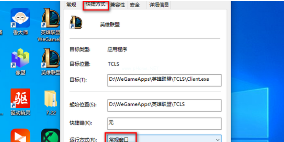 3、再把【快捷方式】中的【運(yùn)行方式】選擇為【常規(guī)窗口】。