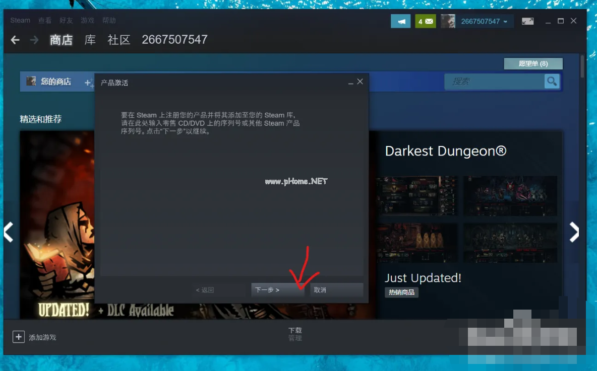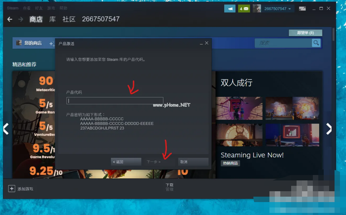 3、在框中輸入激活碼,點擊下一步后即可兌換游戲了。