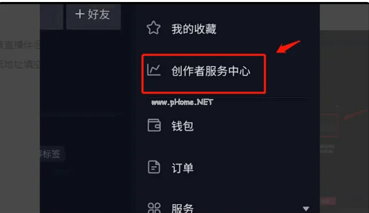 2、在彈出的菜單中點擊“創(chuàng)作者服務(wù)中心”,進入創(chuàng)作者服務(wù)界面。
