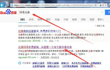 1、搜后弦百度搜索——網(wǎng)易注冊,如圖點擊進(jìn)入網(wǎng)易注冊頁面,注意不要點錯了(直接去網(wǎng)易的官網(wǎng)也可以的)這里方便一點。