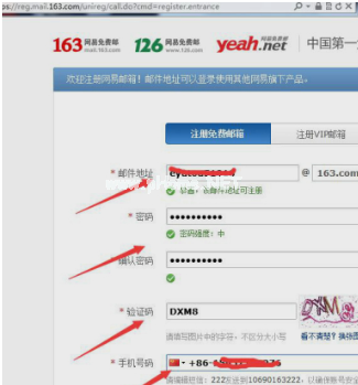 3、填寫完之后大家不要急著提交,會出錯的,這是需要們注意一下,輸入手機號的下面提示,要我們有注冊郵箱的手機發(fā)個短信,發(fā)222到10690163222即可。