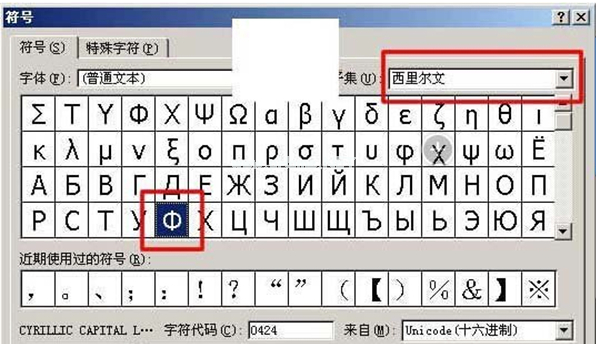 2、在彈出的【符號(hào)】對(duì)話框界面中的【子集】中選擇為【西里爾文】,在下面即可看到直徑符號(hào)了,選擇后插入就可以啦。