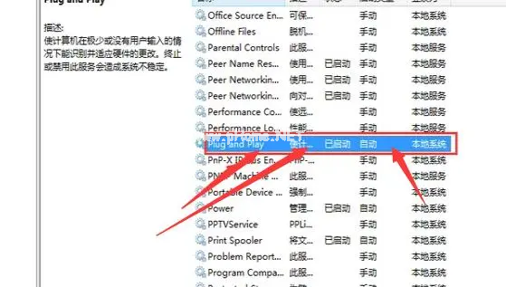 4、接著找到Plug and Play,觀察是否開(kāi)啟,如果是關(guān)閉狀態(tài)則開(kāi)啟。