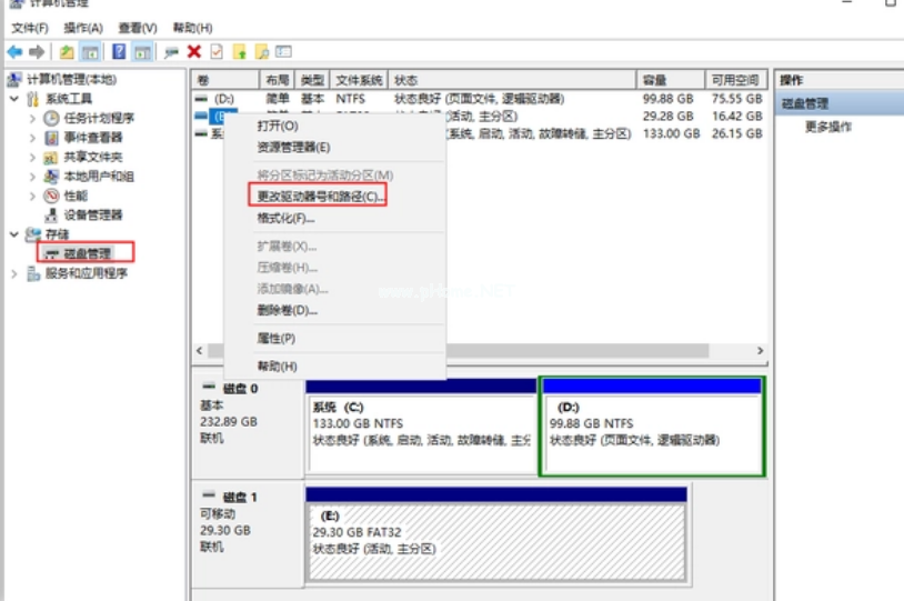 1、進(jìn)入到計(jì)算機(jī)管理界面,在右側(cè)“存儲(chǔ)”的“磁盤(pán)管理”下,找到“可移動(dòng)磁盤(pán)”,點(diǎn)擊選擇“更改驅(qū)動(dòng)器號(hào)和路徑”;