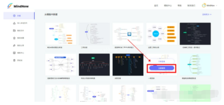 步驟1、在瀏覽器中打開MindNow思維導圖,在“從模板中新建”選擇一個需要的模板,點擊“立即使用”按鈕。