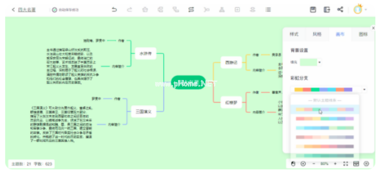 步驟4、思維導圖內(nèi)容編輯完成后,可以根據(jù)個人喜好美化思維導圖的樣式,可以點擊右側(cè)的“更多設置”,通過切換主題風格、設置彩虹線條等方式,讓思維導圖更加美觀。