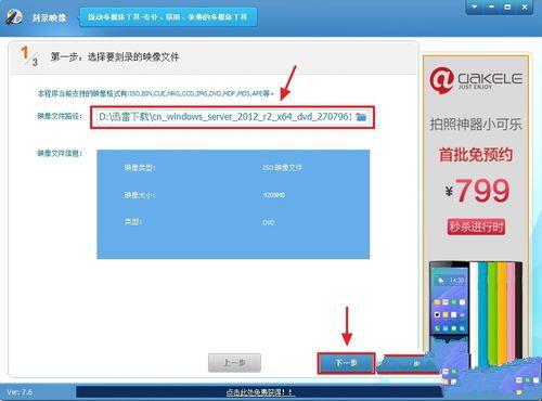 然后就會(huì)進(jìn)入“第一步:選擇要刻錄的映像文件”界面,按箭頭指示單擊以選擇要刻錄的映像文件。映像文件裝載好后,單擊“下一步”