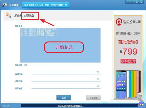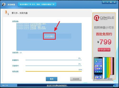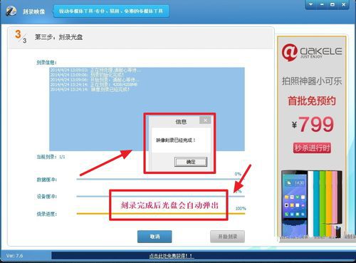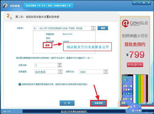 在這一步,即“第二步:選擇刻錄設(shè)備并設(shè)置刻錄參數(shù)”,也就是刻錄的選擇,及檢查光盤是否可刻錄等,會(huì)自動(dòng)檢測(cè)。一切就緒后,程序會(huì)提示“就緒”,而且“開始刻錄”的按鈕也會(huì)變成可操作。單擊“開始刻錄”。