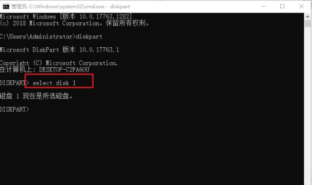5、返回之前打開命令提示符界面,在打開的命令提示符中DISKPART>右側(cè),繼續(xù)輸入命令“select disk 1”敲回車(剛才查看的盤號是幾,我們就在select disk 后面輸幾,比如這里是1。)
