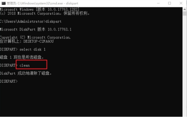 6、選擇磁盤1,也就是u盤后,在DISKPART>右側(cè)繼續(xù)輸入命令“clean”回車確認(rèn),這樣就會清除u盤信息。
