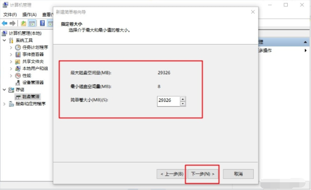 9、接著會彈出新建卷向?qū)е敢缑?,我們按照提示點(diǎn)擊“下一步”,然后確認(rèn)簡單卷大小,點(diǎn)擊“下一步”。